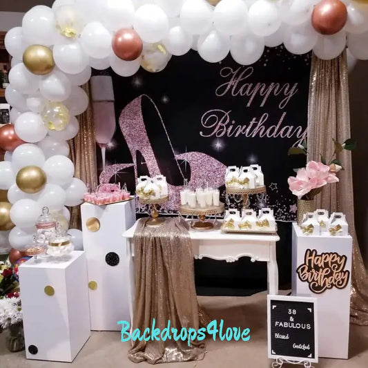Happy Birthday Party Backdrop with Sparkling High Heels and Pink Champagne