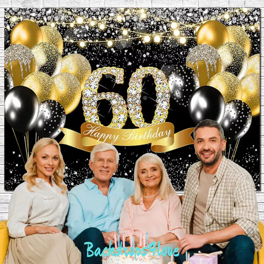 Luxurious Diamond-Styled 60th Birthday Party Backdrop with Gold and Black Balloons